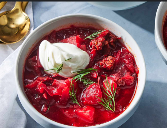 Biasanya borscht disajikan dengan satu sendok smetana (semacam sour cream khas Rusia), yang bikin rasa sup jadi lebih creamy dan lembut. Walaupun sederhana, borscht itu comfort food banget! Cocok dimakan kapan saja—baik musim dingin maupun musim hangat.