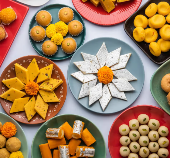 keindahan mithai diwali juga terletak pada variasi tekstur dan warna-warninya yang cerah.