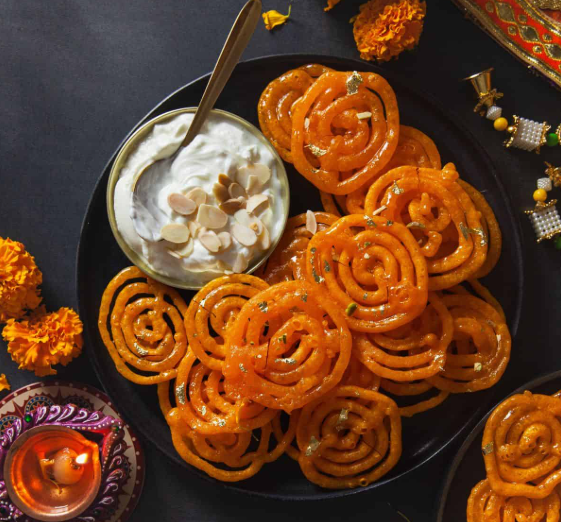 - Jalebi: meskipun bisa ditemukan sepanjang tahun, JALEBI terasa istimewa saat diwali. Ini adalah adonan tepung terigu yang difermentasi, dicetak melingkar-lingkar (pretzel), digoreng hingga renyah, dan segera direndam dalam sirup gula kunyit yang memberikan warna jingga cerah. JALEBI yang renyah di luar dan basah di dalam ini sering disantap hangat sebagai penutup yang crunchy.